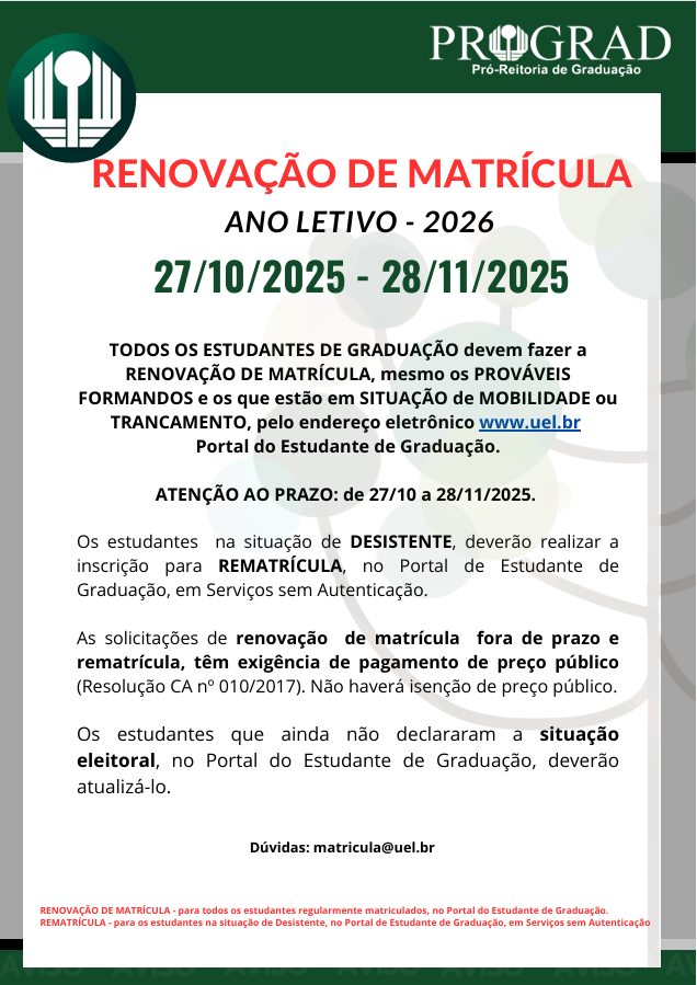 As renovações devem ser feitas até o dia 28 de novembroTeve início no dia 27 de outubro o período de renovação de matrícula para o ano letivo de 2026. As renovações devem ser realizadas exclusivamente pelo Portal do Estudante da UEL.