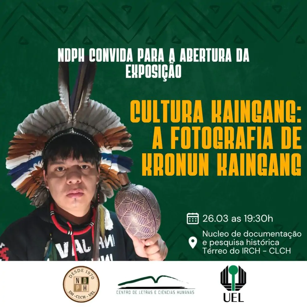 A abertura da mostra será realizada nesta terça (26). A exposição fica disponível ao público até o dia 28 de junho.Nesta terça-feira (26), o Núcleo de Documentação e Pesquisa Histórica (NDPH) será palco de cinema, arte e cultura indígena. A exposição “Cultura Kaingang: a fotografia de Kronun Kaingang”, com início às 19h30, abre a mostra que fica disponível ao público até o dia 28 de junho. O evento de abertura contará com a exibição de um minidocumentário produzido por Kronun sobre a alimentação Kaingang, acompanhado de falas explicativas do artista.