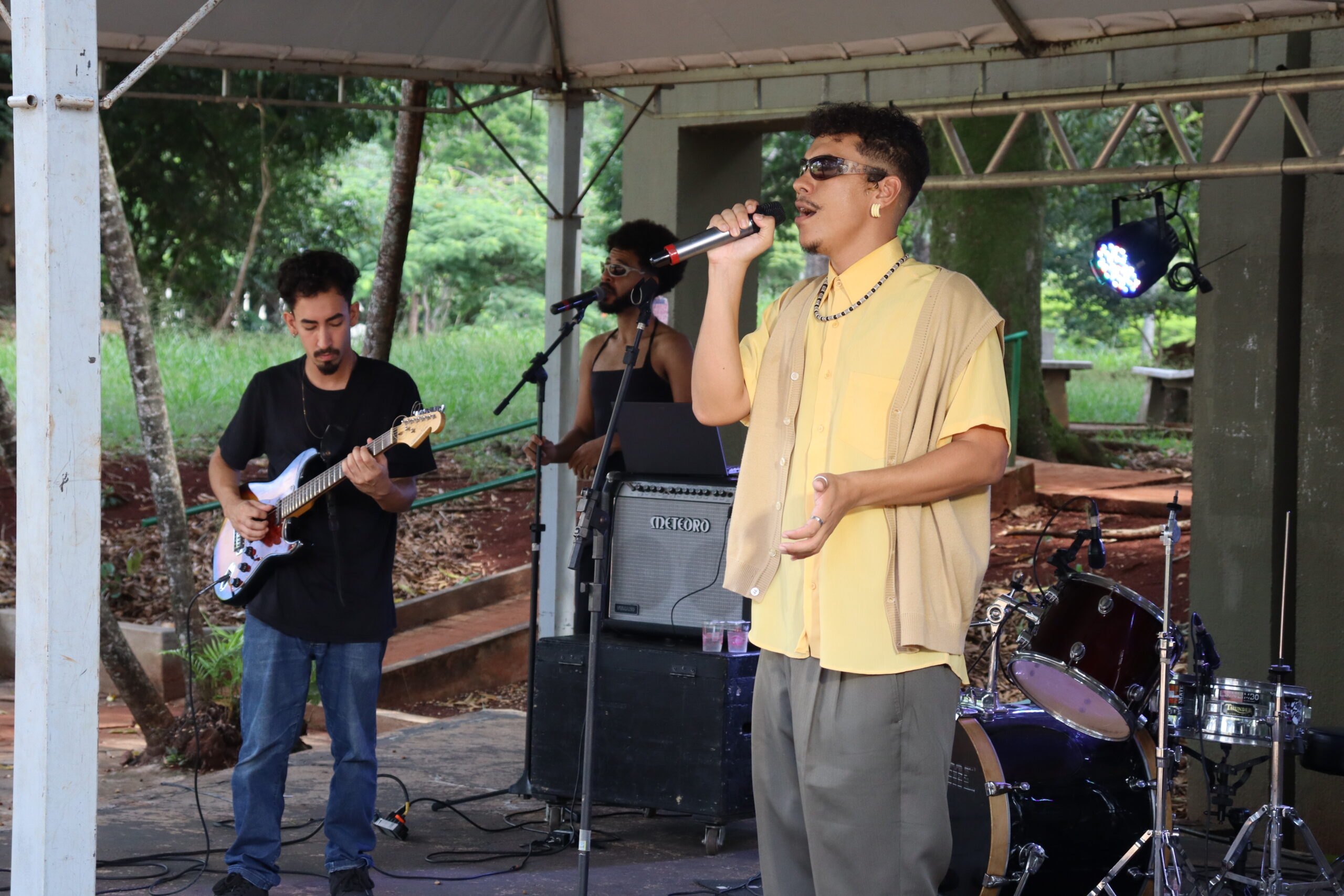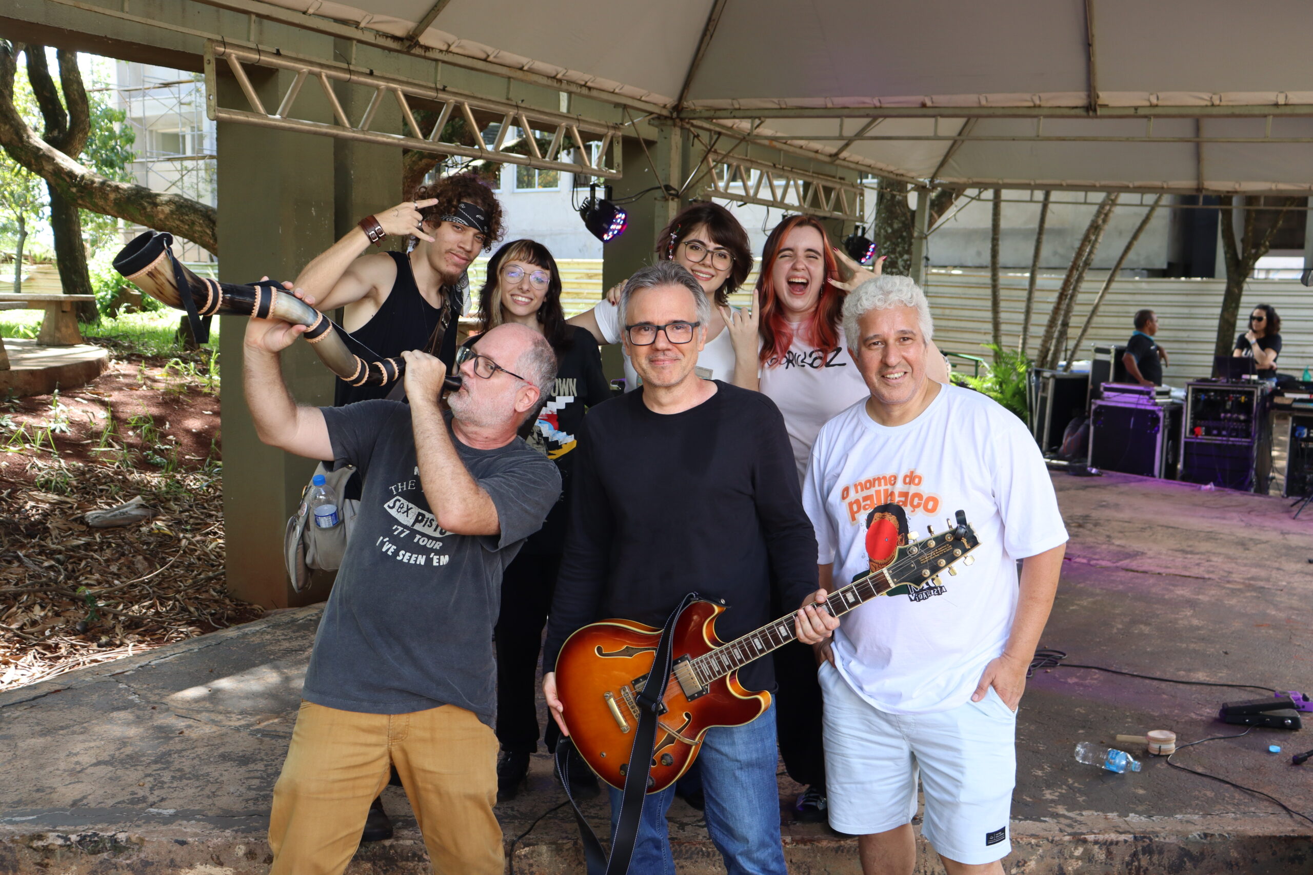 Para encerrar as apresentações do horário de almoço, a banda punk Nic Vigarista, integrada por três docentes do departamento de Jornalismo da UEL, trouxe letras autorais enérgicas, satíricas e descontraídas. Os professores pensaram o show como “uma aula punk”. “Daí o nome Nic Vigarista, porque Nic é o código das disciplinas que a gente ministra no departamento. Então a gente como que criou uma disciplina e aproveita esse momento do show para fazer palestrinha”, contextualiza André Azevedo (guitarra e voz).