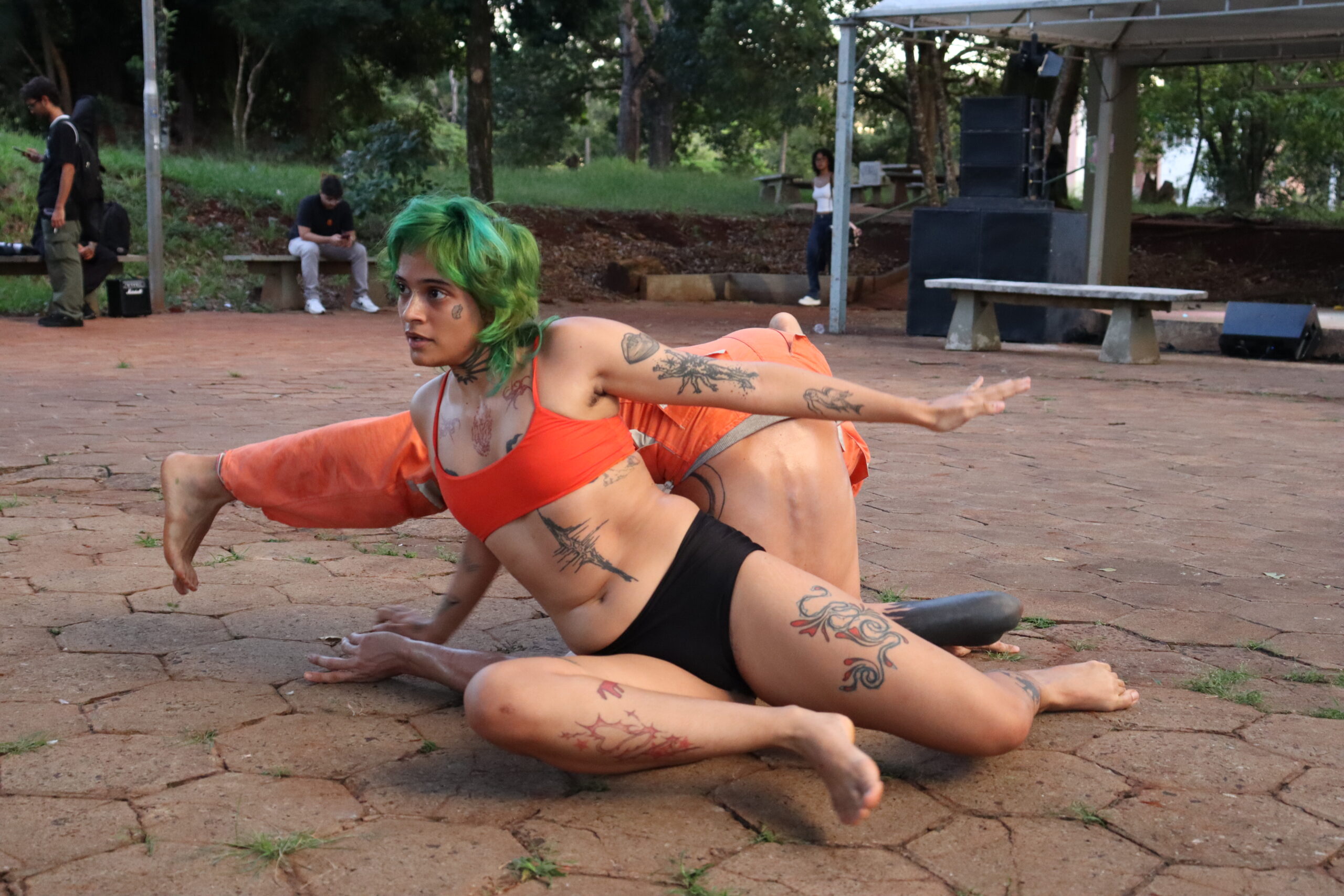 Nani Naan e Lucca Zorca, dançarinos, artistas-pesquisadores, integram a Cia Deslize e levaram uma cena à Mostra. Naan, que se formou em Artes Cênicas, afirma que já organizou muitas mostras artísticas dentro da Universidade. “Além disso, nosso local de ensaio é na Divisão de Artes Cênicas da UEL, então temos já essa ligação com a universidade e sabemos o quanto é importante ocupar os espaços, nós estamos pesquisando há 1 ano”, conta Zorca. Esta apresentação foi inédita. A pesquisa citada por Zorca entende “o corpo como política, a música como dança e vice-versa. Várias categorias que estudei – como jogo, liminaridade e ritual – se transfiguram em infinitas expressões quando encontram o corpo como mídia, acho que é isso que eu mais curto”, afirma. “Na cena `Escalada Intercalada´ as propostas de movimento são guiadas pelo equilíbrio/desequilíbrio, quando encontramos onde subir, escalamos, podendo sempre escorregar, cair, e a dança vai acontecendo nas frestas, onde da pra segurar e apoiar um corpo no outro”, explica.