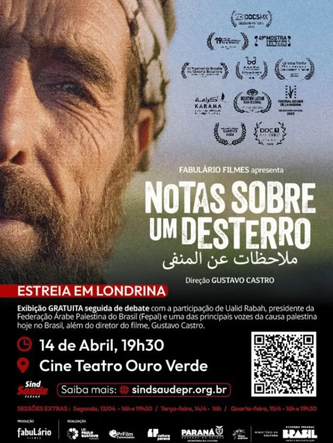 A obra traz registros do encontro com uma família palestina-brasileira na Cisjordânia após intensificação dos bombardeios a Gaza.O SindSaúde-PR, em parceria com a Divisão de Cinema e Vídeo da UEL, promove de 13 a 15 de abril, sessões gratuitas no Cine Teatro Ouro Verde do documentário “Notas Sobre um Desterro”, às 16h e às 19h30. Especialmente no dia 14, após a sessão das 19h30, acontece um debate com a participação Ualid Rabah, presidente da Federação Árabe Palestina do Brasil (Fepal), uma das principais vozes da causa palestina no país. O encontro também contará com a presença do diretor da obra, o cineasta paranaense Gustavo Castro. A inscrição para participar do debate deve ser feita através do formulário disponível aqui.