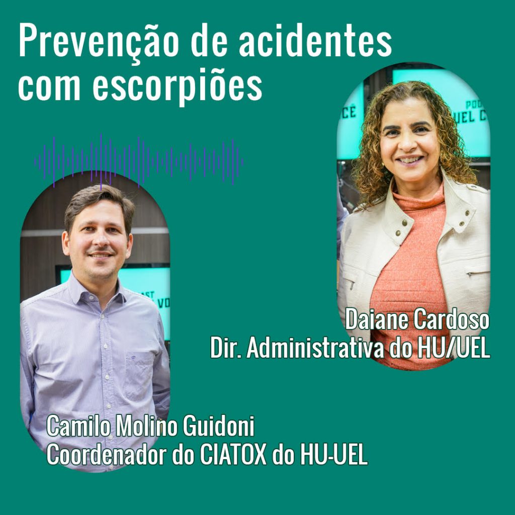 Episódio comemora 40 anos de atividade do Centro de Informação e Assistência Toxicológica de Londrina (CIATox)O mais recente episódio do podcast “HU-UEL com você” trouxe alertas e informações relevantes sobre a prevenção de acidentes com escorpiões, crescentes no país. O programa, apresentado por Ana Luisa Camilo Sversutti, da Assessoria de Comunicação do Hospital Universitário da UEL, recebeu como convidados o coordenador do Centro de Informação e Assistência Toxicológica de Londrina (CIATox) e docente da universidade, Camilo Molino Guidoni, e a diretora administrativa do hospital, Daiane Cardoso. A edição celebrou os 40 anos de atuação do CIATox na cidade, alcançados em abril deste ano.