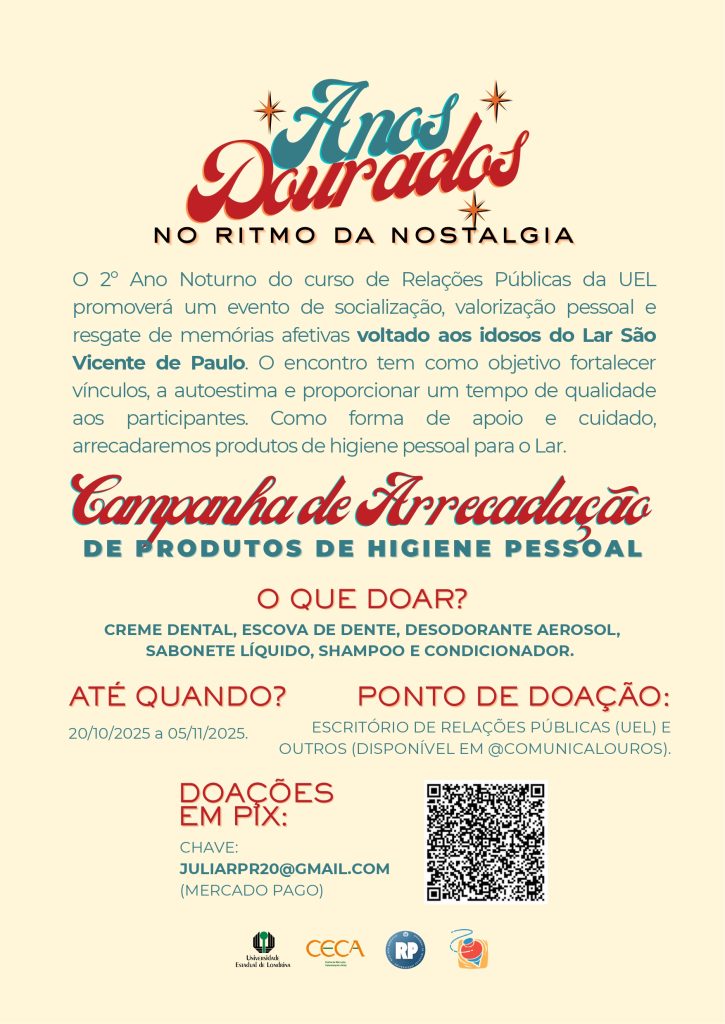 Iniciativa prevê uma tarde de festa, música e carinho para os idosos do Lar São Vicente de Paulo, a primeira Instituição de Longa Permanência para Idosos de Londrina, fundada há 65 anos.Promover um dia especial repleto de atividades de autocuidado e interação junto aos idosos do Lar São Vicente de Paulo, com os objetivos de resgatar memórias afetivas da juventude, incentivar a socialização e receber doações de produtos de higiene. Este é o mote do evento “Anos Dourados – No Ritmo Da Nostalgia”, promovido por estudantes do segundo ano do curso de Relações Públicas da Universidade Estadual de Londrina e programado para a tarde do dia 9 de novembro.