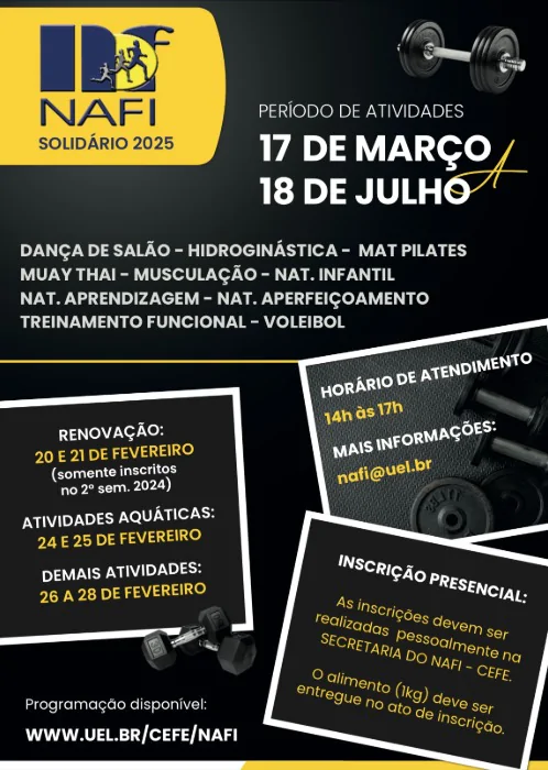 O período de realização das atividades é de 4 meses, entre os dias 17 de março e 18 de julho. A taxa de inscrição, no entanto, é única, devendo ser realizadas pessoalmente, na secretaria do Nafi, no Cefe, das 14h às 17h. O projeto ainda solicita a entrega de 1kg de alimento perecível como parte da campanha Nafi Solidário, que há mais de 10 anos destina mantimentos para organizações assistenciais. Em 2024, o projeto arrecadou cerca de 400 kg para a Igreja Presbiteriana de Londrina
