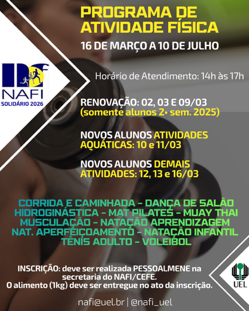 Serão ofertadas mais de 250 vagas voltadas para diversas faixas etárias e modalidades. Nafi Solidário arrecada alimentos para entidades assistenciaisA fim de contribuir para a promoção da saúde da população por meio da prática de atividade/exercício físico, o Nafi – Programa de Atividade Física da UEL, está com as inscrições abertas para interessados em participar das modalidades deste primeiro semestre.