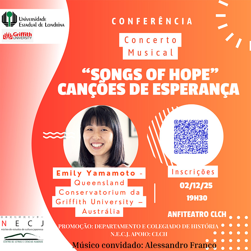 A palestra será proferida pela pesquisadora, cantora, violonista e compositora Emily YamamotoO Departamento e Colegiado do curso de História, juntamente com o Núcleo de Estudos de Cultura Japonesa (NECJ) promovem, na próxima terça (2), às 19h30, no Anfiteatro do CLCH, uma palestra-concerto musical. Intitulada “Songs of Hope” (“Canções de esperança”), a palestra será proferida pela pesquisadora, cantora, violonista e compositora Emily Yamamoto, doutoranda pela Queensland Conservatorium da Griffith University (Austrália).