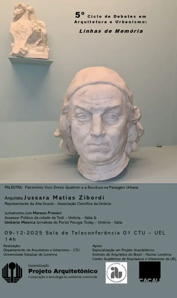 Convidada vai proferir a palestra "Patrimônio Vivo: Enrico Quattrini e a Escultura na Paisagem Urbana"O Departamento de Arquitetura e Urbanismo realiza, nesta terça (9), o 5º Ciclo de Debates em Arquitetura e Urbanismo. O objetivo é promover discussões sobre a gestão do patrimônio histórico nas cidades. Às 14 horas, haverá uma palestra com a arquiteta Jussara Matias Zibordi. Ela é a representante da Associação Científica Alta Scuola, da região da Umbria na Itália. Estará na UEL para proferir a palestra “Patrimônio Vivo: Enrico Quattrini e a Escultura na Paisagem Urbana”.