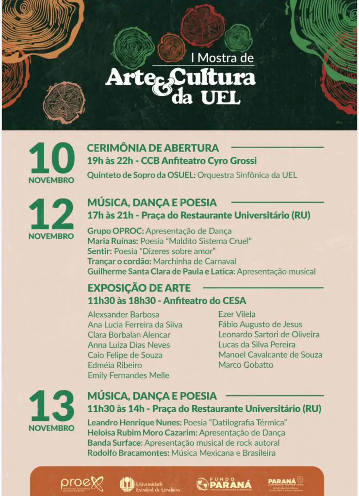 Silvia Pavesi é docente no Centro de Educação Física e Esportes da UEL e coordena o Grupo de Dança OPROC, que se apresentará às 17h do dia 12. Para ela, “a realização conjunta com a Mostra Cultural agrega um valor simbólico e formativo ao reconhecer a arte e a produção cultural local como dimensões complementares da formação universitária”. Pavesi complementa que “essa integração ultrapassa o tripé tradicional da universidade, enfatizando que o fazer artístico e cultural também constitui uma forma de conhecimento e transformação social”.