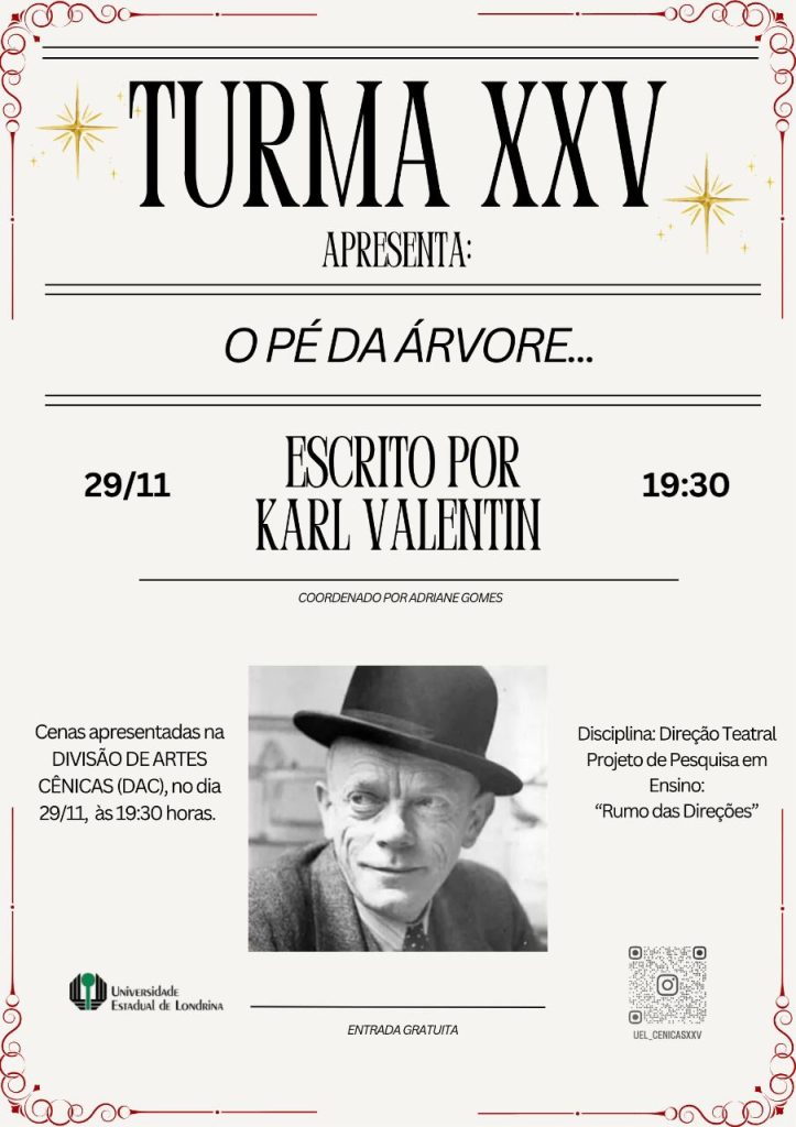 Karl Valentin ou Valentin Ludwig Fey viveu entre 1882 e 1948, nascido em Munique (Alemanha) e foi marceneiro, cantor, inventor, ator, comediante, escritor e produtor cinematográfico. Teve grande influência na cultura alemã e nos trabalhos de Bertolt Brecht e Samuel Beckett, às vezes chamado de “Charlie Chaplin da Alemanha” e autor da obra “O Pé da Árvore de Natal”. A sinopse do texto trata de uma família um pouco atrapalhada e incomum que se prepara para a data mais mágica do ano, o Natal, envolvendo a decoração da casa, troca de presentes e faltando alguns dias para o evento, procuram um “chamineiro” para arrumar sua chaminé para o evento, mas ele nota que algo não está certo…