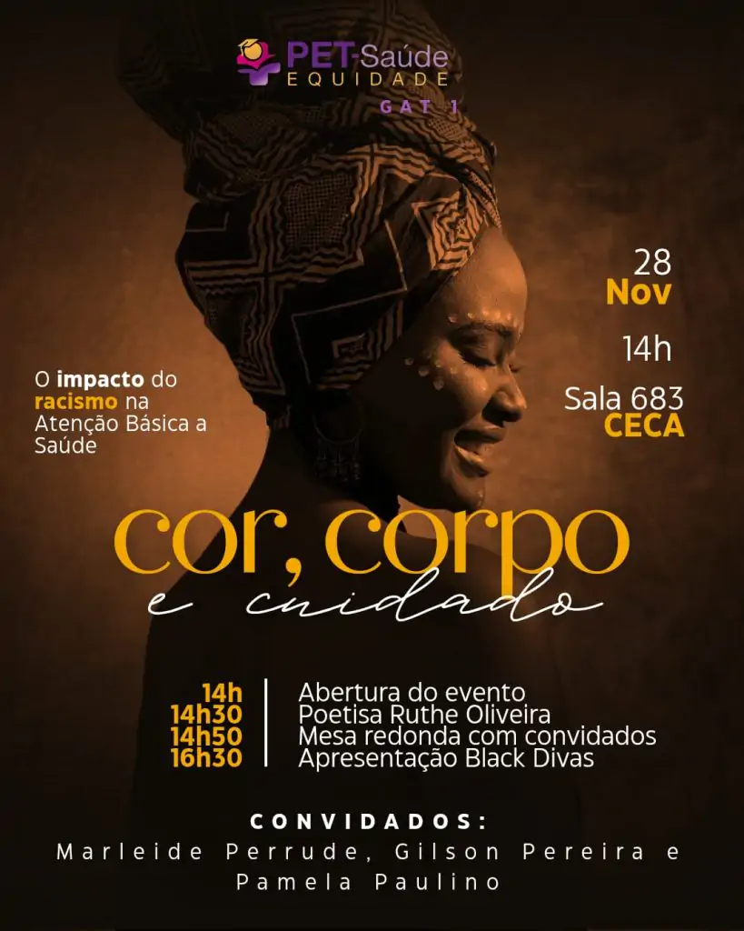 O evento “Cor, Corpo e Cuidado: o impacto do Racismo na Atenção Primária à Saúde” é desenvolvido pelo GAT 1 (Grupo de Aprendizagem tutorial) do projeto, grupo que trabalha com a valorização das trabalhadoras e futuras trabalhadoras no âmbito do SUS, fomentando discussões sobre Gênero, Identidade de Gênero, Sexualidade, Raça, Etnia, Deficiências e as interseccionalidades no Trabalho na Saúde.