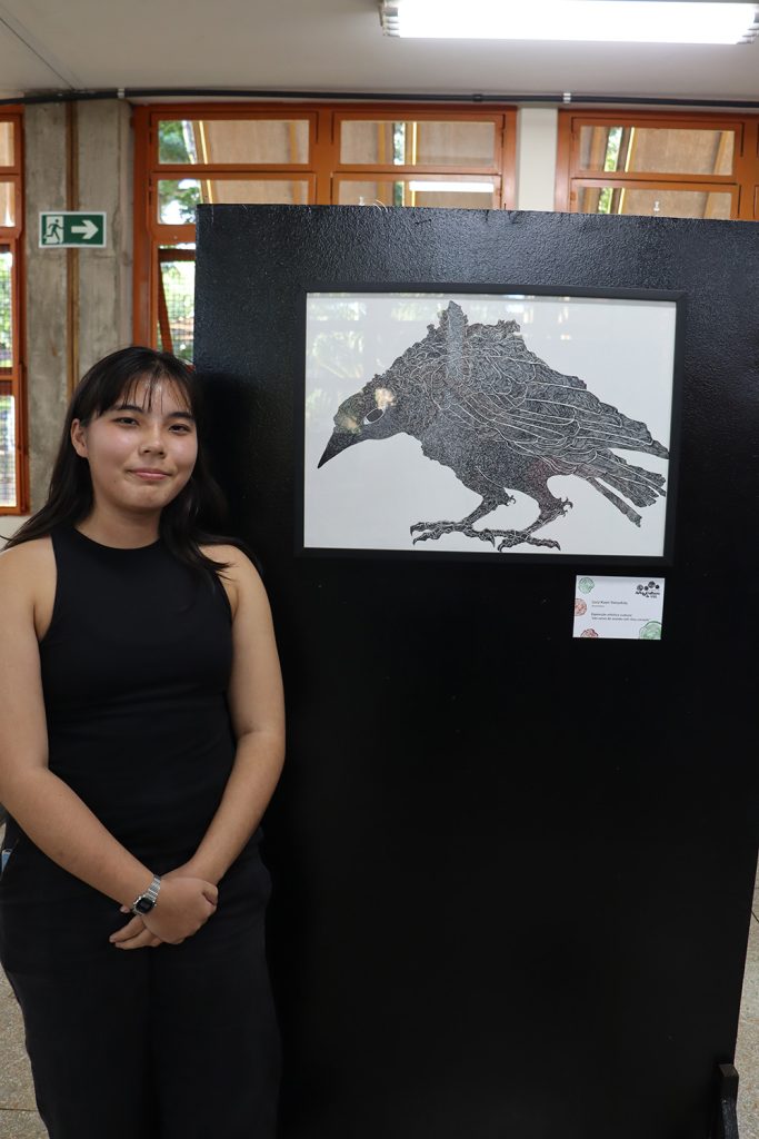 Livia Kaori Yamashita, estudante de Medicina Veterinária, participou do Por Extenso em 2025, ocasião em que ocorreu a primeira Mostra de Arte e Cultura. Neste ano, ao receber o formulário, ficou entusiasmada com a oportunidade e trouxe o desenho intitulado “Um Corvo de Acordo com Meu Coração”. A arte fala alto em sua vida, tanto que ao prestar vestibular, Yamashita enfrentou um de seus maiores dilemas: “escolher entre a área de biologia ou a área artística”. Unindo ambos, inscreveu-se na Mostra.
