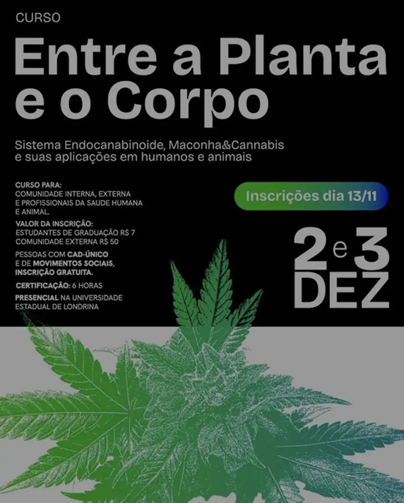 Curso “Entre a planta e o corpo”, acontece nos dias 2 e 3 de dezembroO curso “Entre a planta e o corpo: Sistema Endocanabinoide: maconha & cannabis e suas aplicações em humanos e animais”, será ministrado na UEL nos dias 02 e 03 de dezembro pela Associação Canábica Maria Flor, de Marília (SP). A formação é uma parceria entre a Associação, o Programa de Extensão Práxis Itinerante e a Associação Canábica Cura em Flor.