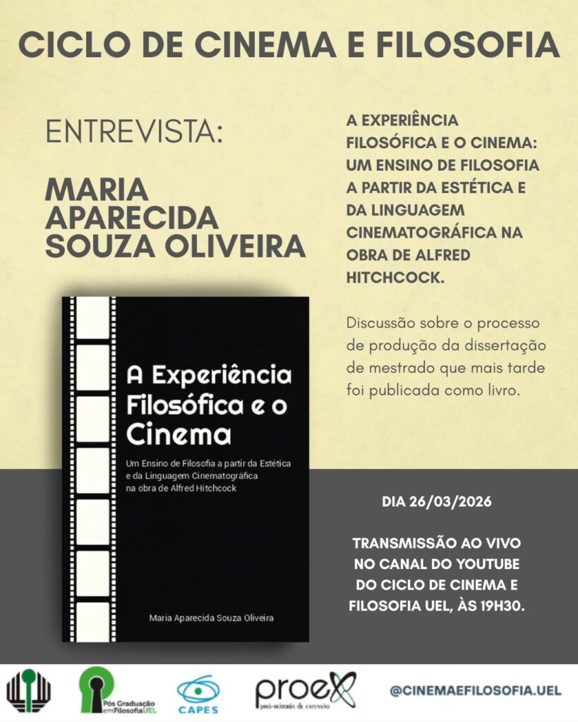 Convidada estudou a produção de experiências cinematográficas por meio das obras de suspense do cineasta.Produzir experiências cinematográficas capazes de levar estudantes à desnaturalização e transformação da percepção sobre cinema, com um olhar mais sensível voltado à produções que fogem do padrão comercial. Esse será o tema do próximo encontro que marca o retorno das atividades do projeto de extensão “Ciclo de Cinema e Filosofia”, da Universidade Estadual de Londrina (UEL). A transmissão acontece amanhã (quinta, 26), a partir das 19h30 pelo canal do projeto no Youtube. A convidada será a professora e pesquisadora Maria Aparecida Souza Oliveira.