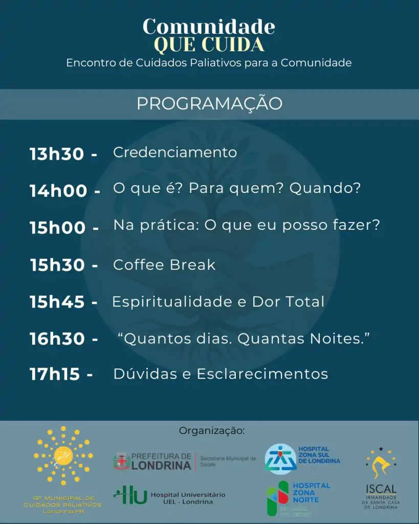 O Grupo de Trabalho Municipal de Cuidados Paliativos de Londrina, com participação da Equipe Interdisciplinar de Cuidados Paliativos (EICP) do HU-UEL, organiza o evento “Comunidade que Cuida: Encontro de Cuidados Paliativos para a Comunidade”, voltado especialmente a lideranças comunitárias, conselheiros de saúde, voluntários, representantes de entidades civis e cuidadores, além de ser aberto ao público em geral.