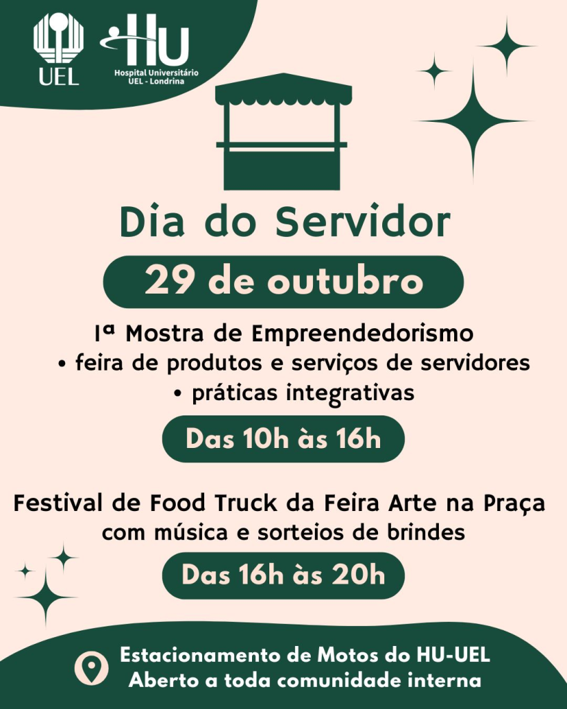 As atividades acontecem no Estacionamento de Motos do HU-UEL e são abertas a toda a comunidade internaPara comemorar o Dia do Servidor, o Hospital Universitário da UEL realiza, no dia 29 de outubro (quarta-feira), um evento especial preparado pela Comissão Social, com atividades que integram lazer, integração e valorização dos colaboradores.