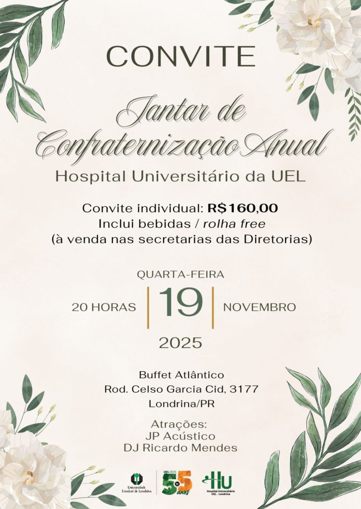 O Hospital Universitário (HU) da UEL organiza seu Jantar de Confraternização Anual por adesão. O evento acontece no dia 19 de novembro (quarta-feira), véspera de feriado, às 20h.