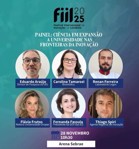 Para além da contribuição acadêmica, a presença da UEL no Festival representa seu compromisso com o ecossistema de inovação de Londrina.A Universidade Estadual de Londrina participa do Festival Internacional de Inovação de Londrina (FIIL 2025), realizado no Parque Ney Braga, nesta quinta (27) e sexta-feira (28). O evento reúne gestores públicos, pesquisadores, empreendedores e representantes do ecossistema de inovação para discutir tendências, políticas públicas e soluções tecnológicas que impulsionam o desenvolvimento regional. Serão dois dias de atividades divididas em quatro arenas temáticas: Estação 43, Sebrae, Conexões e Paraná.