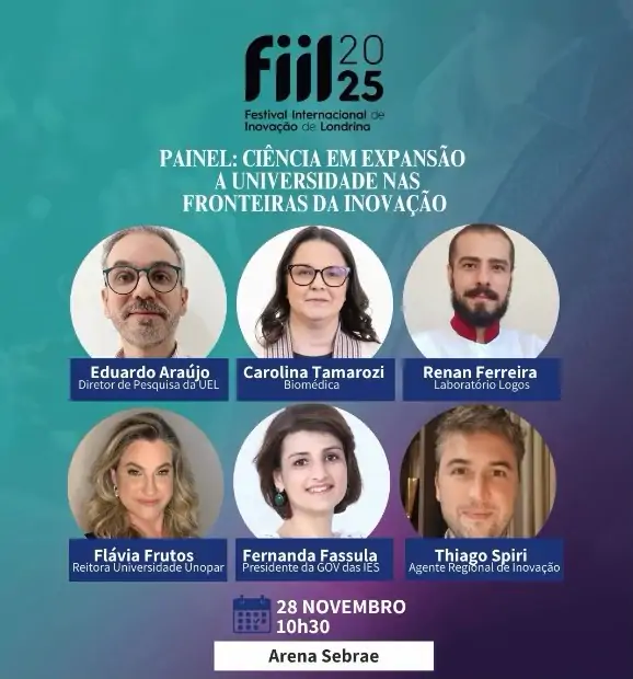 Para além da contribuição acadêmica, a presença da UEL no Festival representa seu compromisso com o ecossistema de inovação de Londrina.A Universidade Estadual de Londrina participa do Festival Internacional de Inovação de Londrina (FIIL 2025), realizado no Parque Ney Braga, nesta quinta (27) e sexta-feira (28). O evento reúne gestores públicos, pesquisadores, empreendedores e representantes do ecossistema de inovação para discutir tendências, políticas públicas e soluções tecnológicas que impulsionam o desenvolvimento regional. Serão dois dias de atividades divididas em quatro arenas temáticas: Estação 43, Sebrae, Conexões e Paraná.