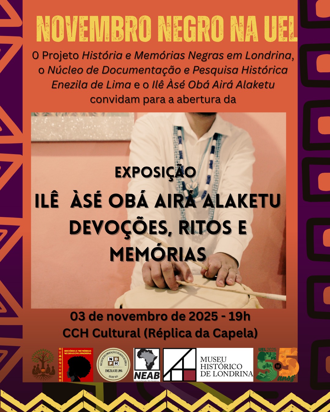 Na abertura oficial, programada para 18h30, estão previstas atividades como uma roda de capoeira, a abertura da exposição “Ilê Asé Obá Ayrá- Devoções, Ritos e Memórias”, e a projeção do documentário “Passado/Presente do Movimento Negro”, seguida de uma roda de conversa com lideranças de Londrina. O evento é presencial, na Réplica da Primeira Igreja Matriz de Londrina, no Calçadão da UEL.
