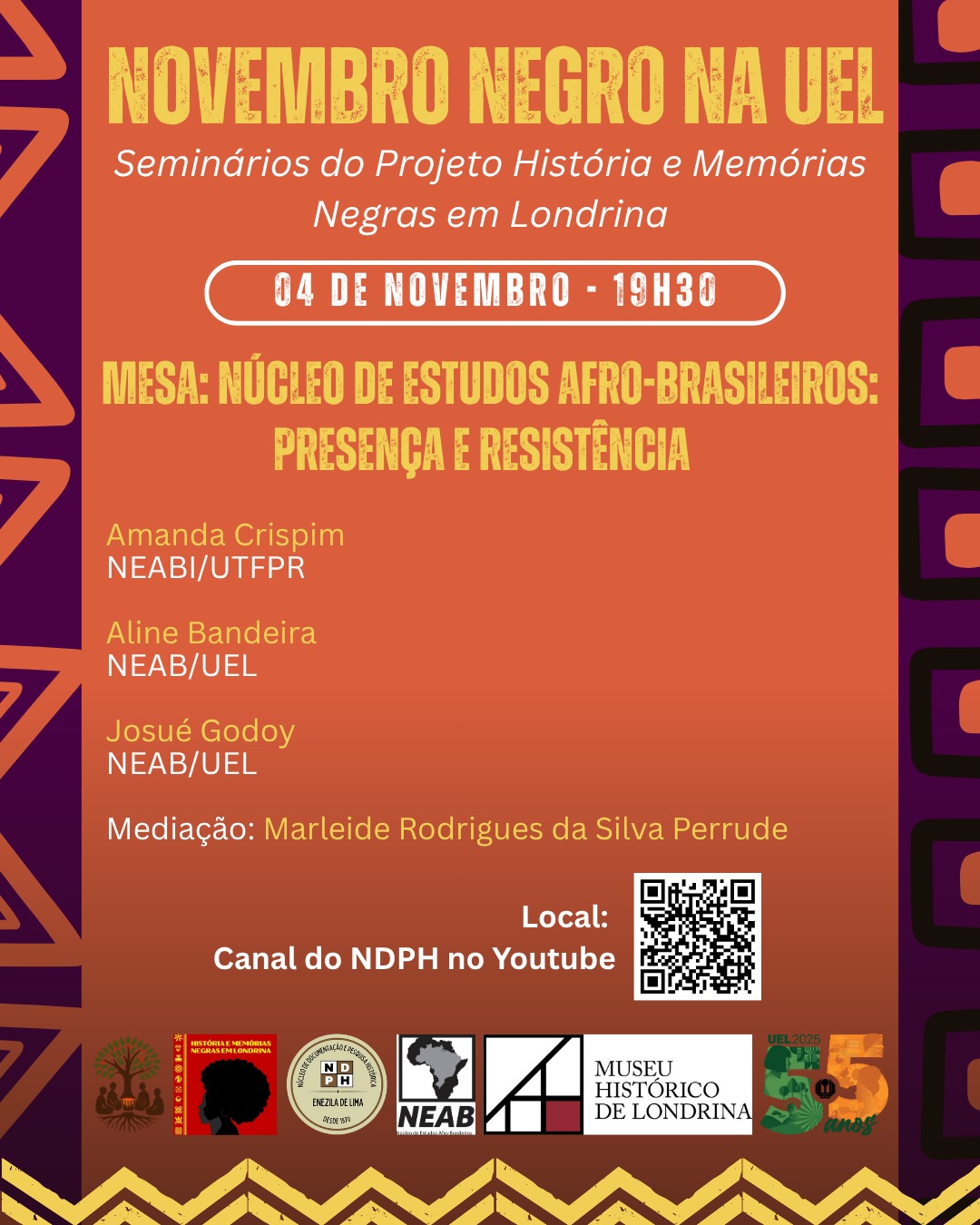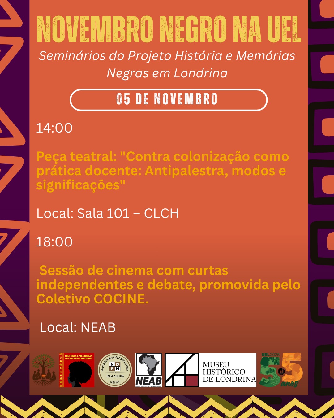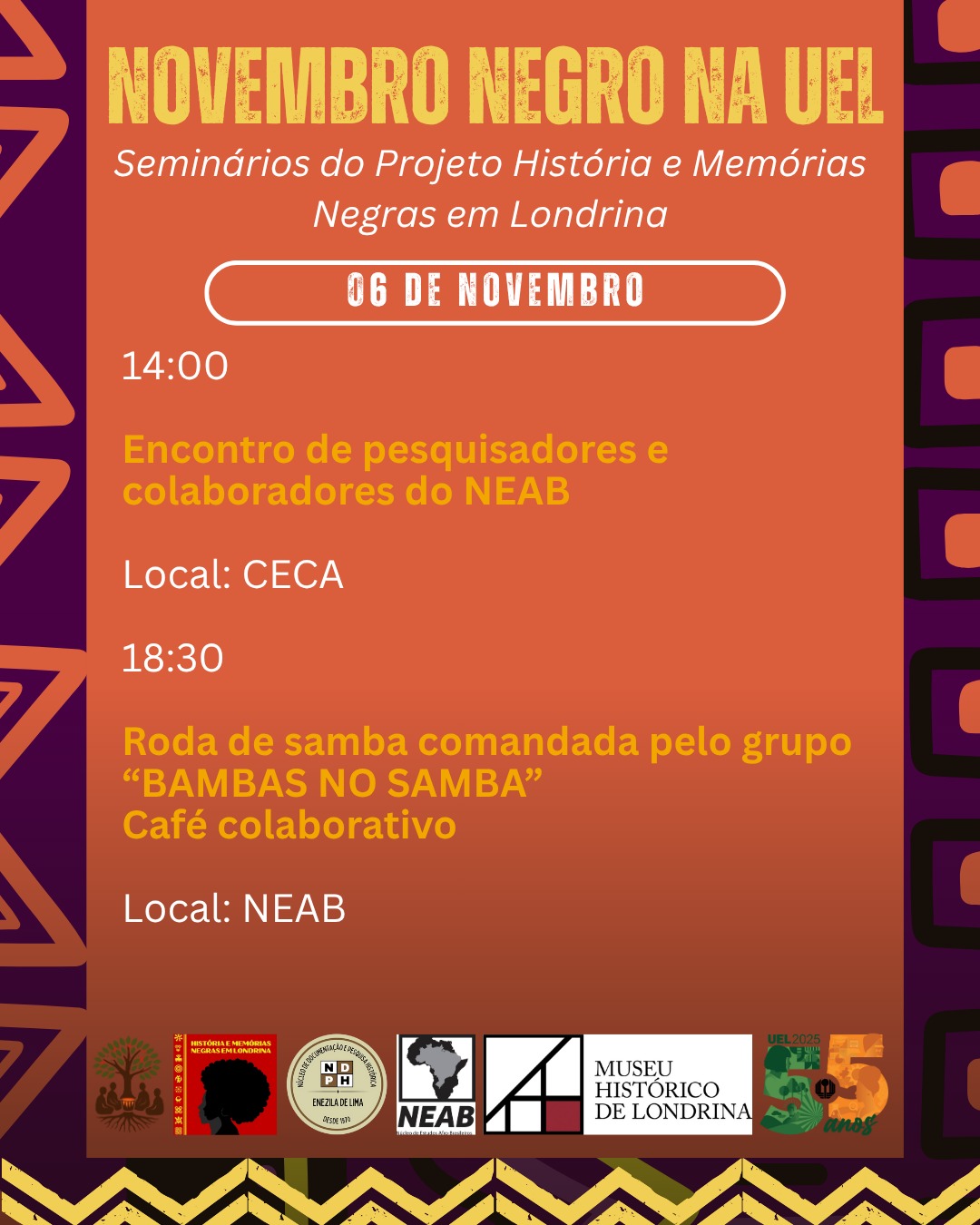 A programação institucional percorre o mês por meio do Novembro Negro 2025, que integra ações e setores da Universidade, realizada por meio do Núcleo de Estudos Afro-brasileiros (NEAB), com apoio do Grupo de Trabalho UEL na Luta Contra o Racismo, e setores como o Núcleo de Documentação e Pesquisa Histórica (NDPH/UEL), Museus Histórico de Londrina Pe. Carlos Weiss, Assessoria de Relações Internacionais (ARI), Programa de Apoio à Permanência (Prope) e Lab-Escrivências, além da Secretaria Municipal de Cultura de Londrina e do Conselho Municipal da Promoção da Igualdade Racial e projetos de pesquisa, ensino e extensão vinculados ao NEAB.