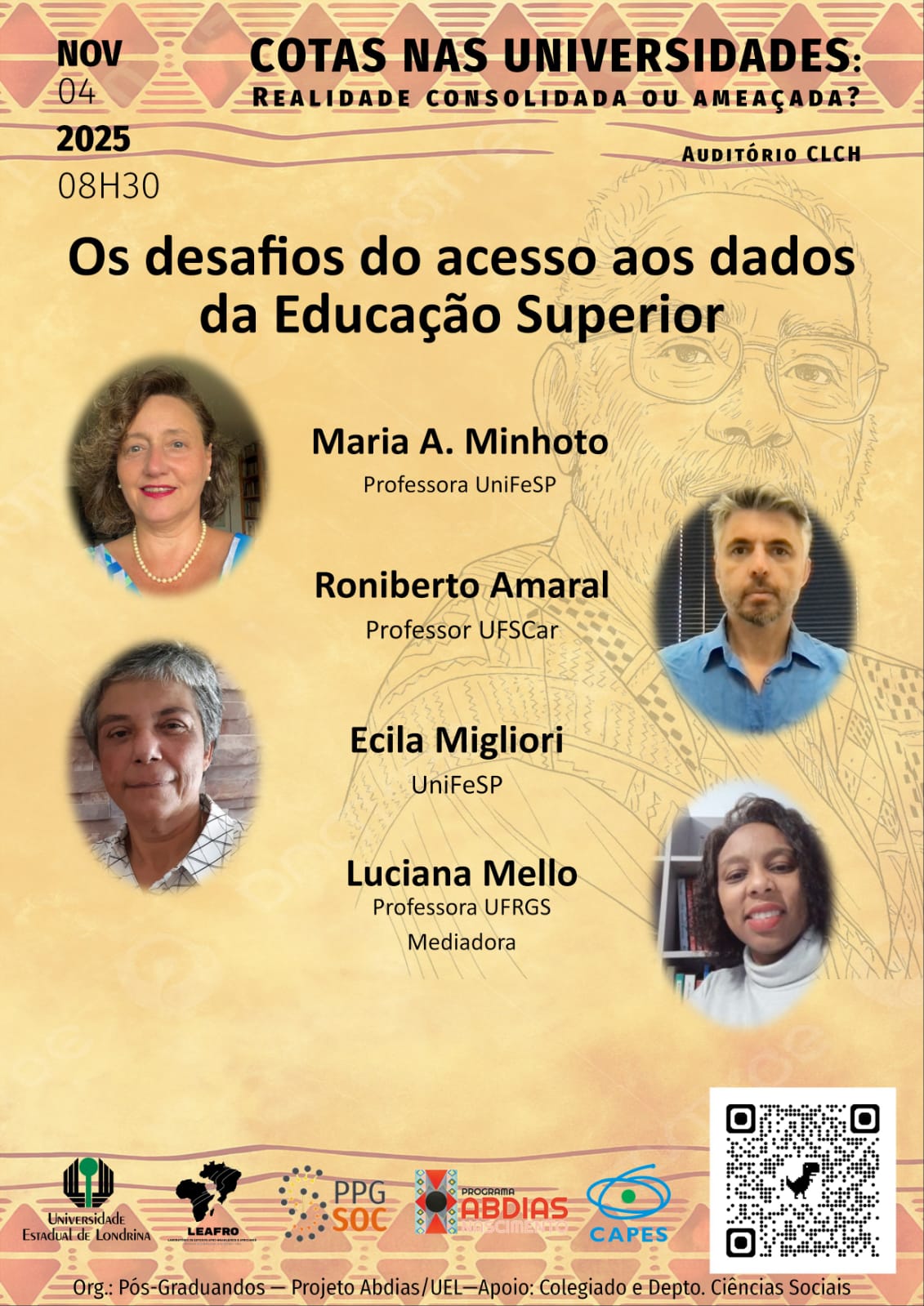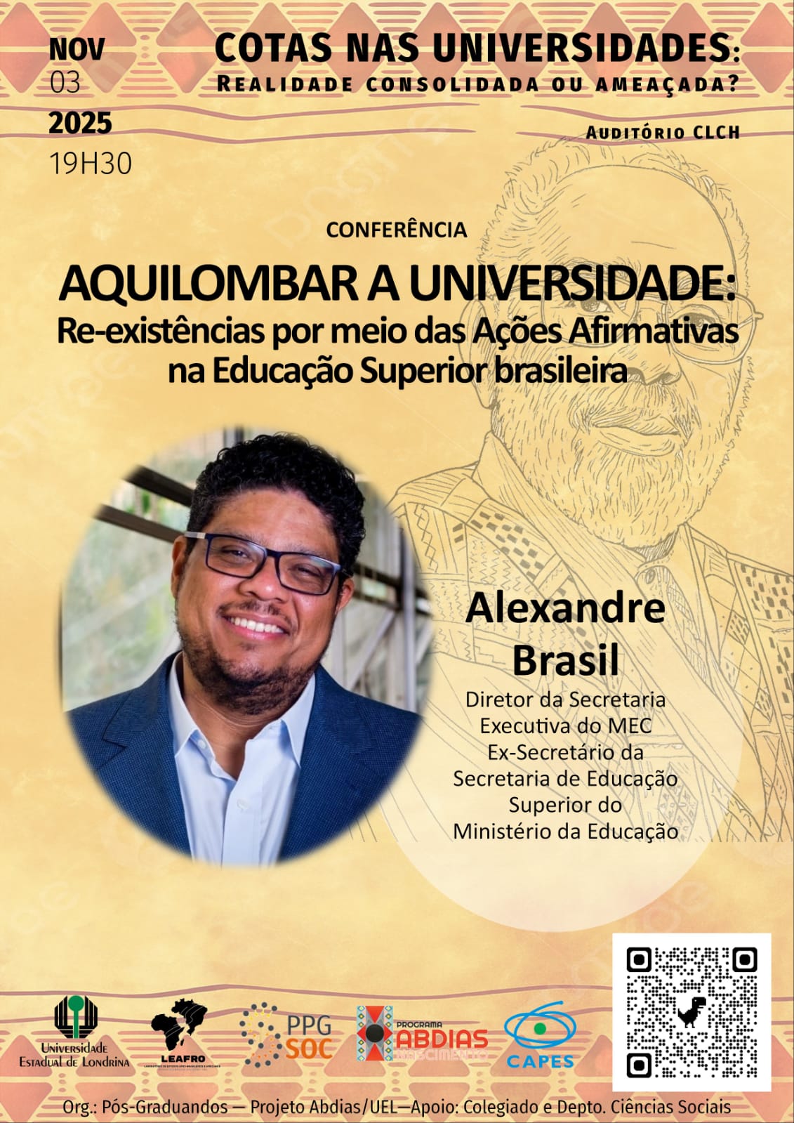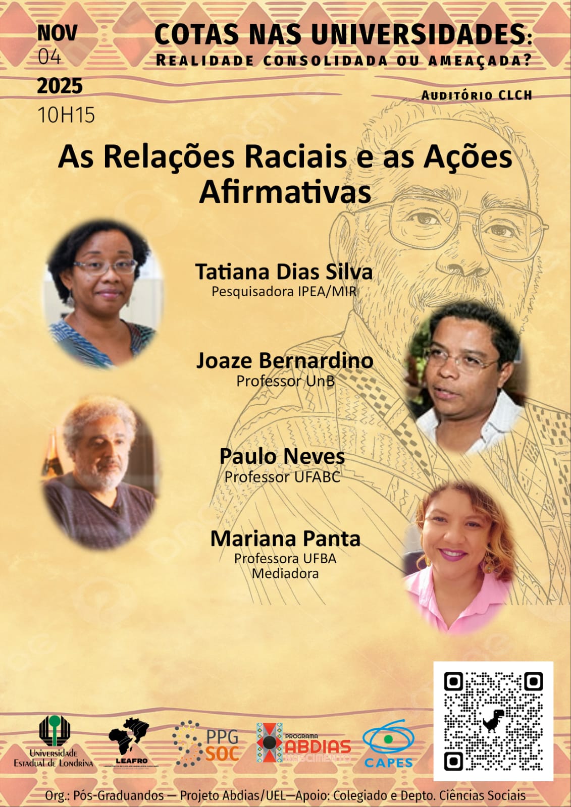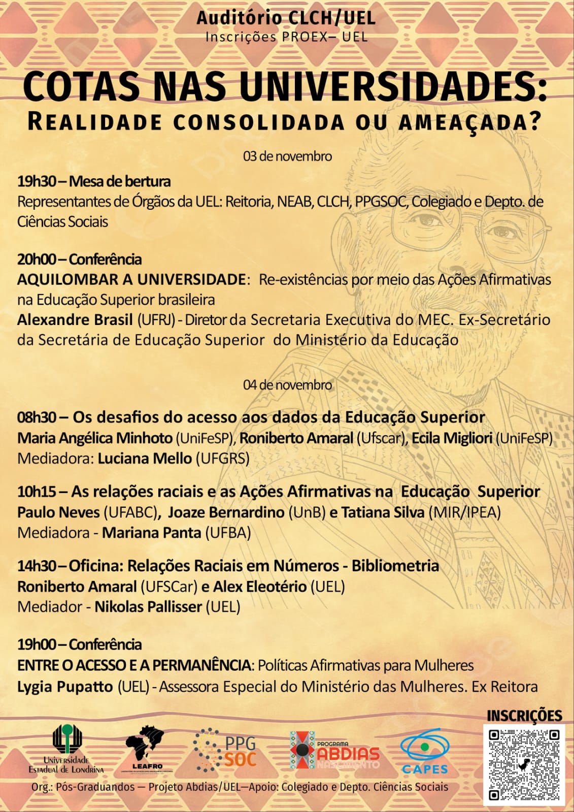 Nesta segunda e terça-feira, o Laboratório de Estudos Afro-Brasileiros e Africanos da UEL realiza o debate “Cotas nas Universidades: realidade consolidada ou ameaçada?”, no Anfiteatro Maior do Centro de Letras e Ciências Humanas. Com início na noite desta segunda, às 19h30, o evento tem o objetivo de promover o debate sobre as políticas de ação afirmativa no ensino superior, analisando avanços, desafios e perspectivas diante do contexto político e social contemporâneo, com vistas a fortalecer a consolidação das cotas e outras iniciativas voltadas à equidade racial e de gênero nas universidades.