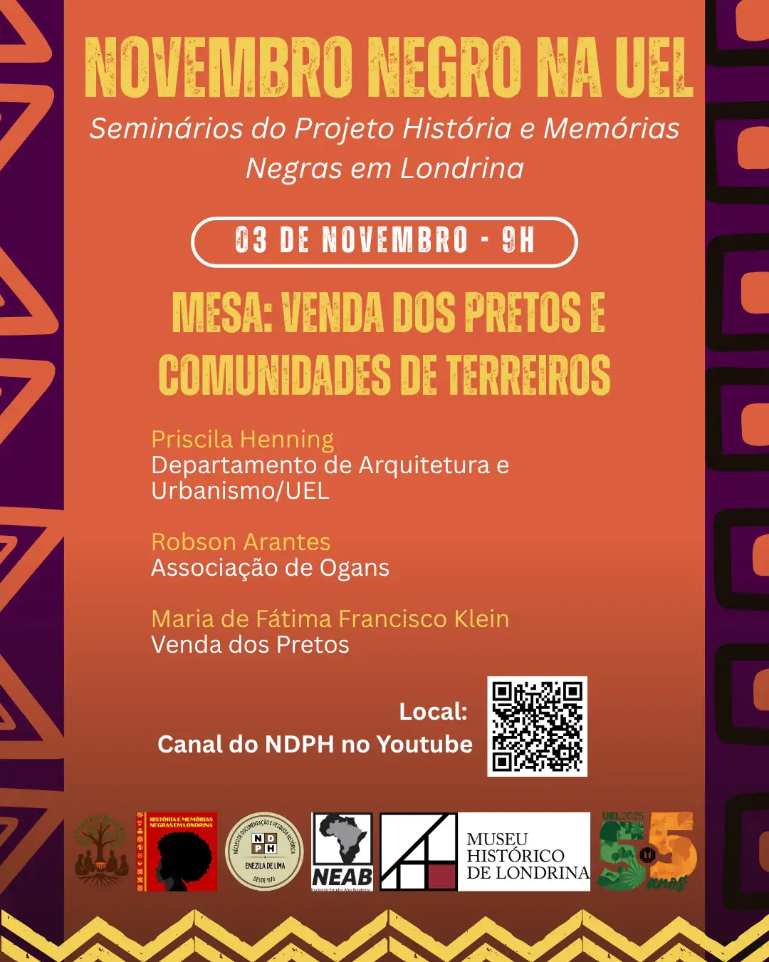 Pela manhã, às 9h, será realizada a mesa redonda Venda dos pretos e Comunidade de terreiros, com Priscila Henning, Robson Arantes e Maria de Fátima Francisco Kelins. A transmissão será pelo canal do NDPH no Youtube.