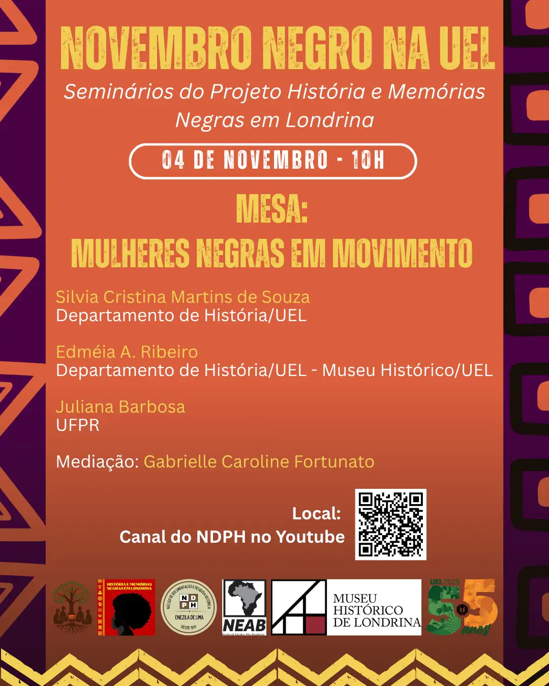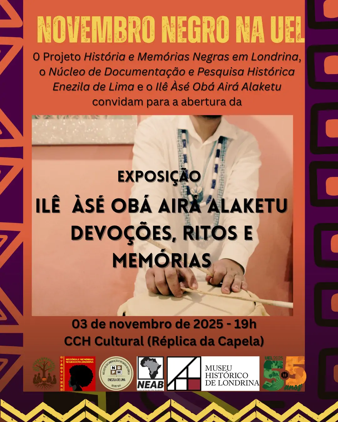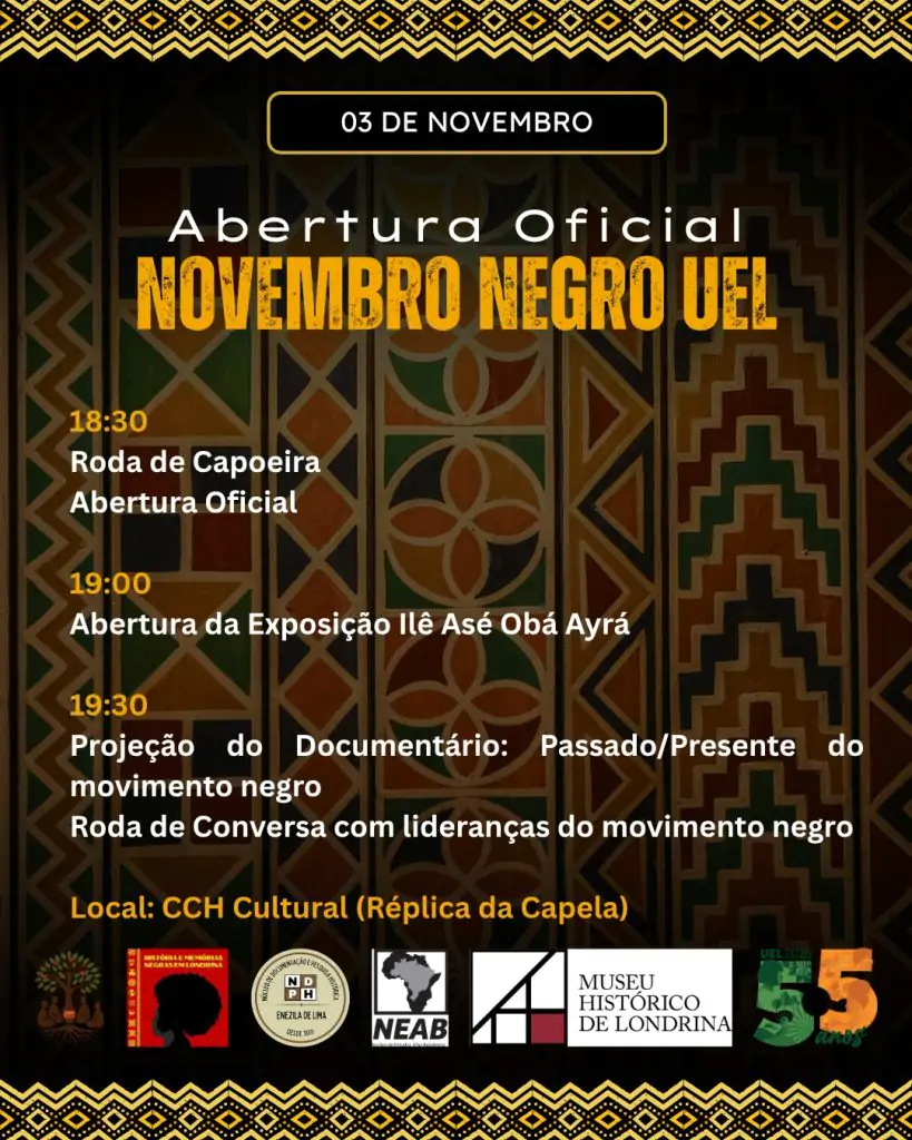 A programação institucional percorre o mês por meio do Novembro Negro 2025, que integra ações e setores da Universidade, realizada por meio do Núcleo de Estudos Afro-brasileiros (NEAB), com apoio do Grupo de Trabalho UEL na Luta Contra o Racismo, e setores como o Núcleo de Documentação e Pesquisa Histórica (NDPH/UEL), Museus Histórico de Londrina Pe. Carlos Weiss, Assessoria de Relações Internacionais (ARI), Programa de Apoio à Permanência (Prope) e Lab-Escrivências, além da Secretaria Municipal de Cultura de Londrina e do Conselho Municipal da Promoção da Igualdade Racial e projetos de pesquisa, ensino e extensão vinculados ao NEAB.