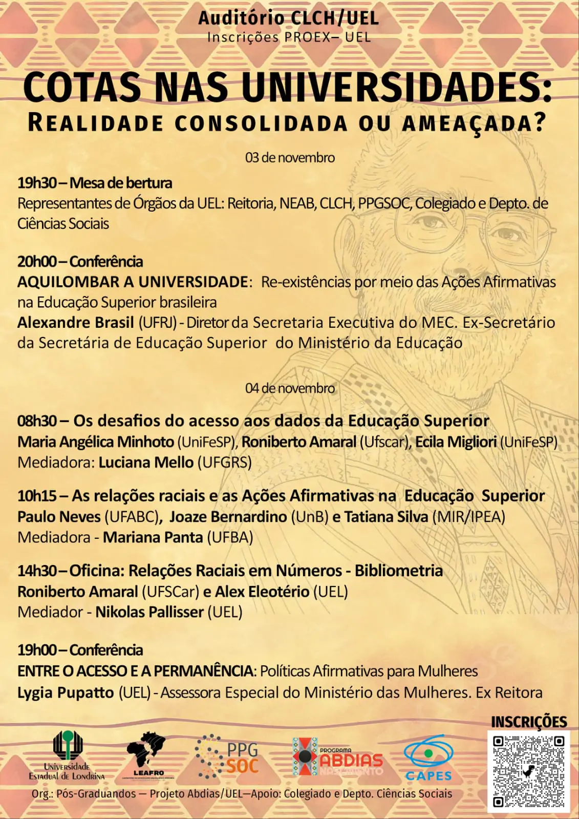 Nesta segunda e terça-feira, o Laboratório de Estudos Afro-Brasileiros e Africanos da UEL realiza o debate “Cotas nas Universidades: realidade consolidada ou ameaçada?”, no Anfiteatro Maior do Centro de Letras e Ciências Humanas. Com início na noite desta segunda, às 19h30, o evento tem o objetivo de promover o debate sobre as políticas de ação afirmativa no ensino superior, analisando avanços, desafios e perspectivas diante do contexto político e social contemporâneo, com vistas a fortalecer a consolidação das cotas e outras iniciativas voltadas à equidade racial e de gênero nas universidades.