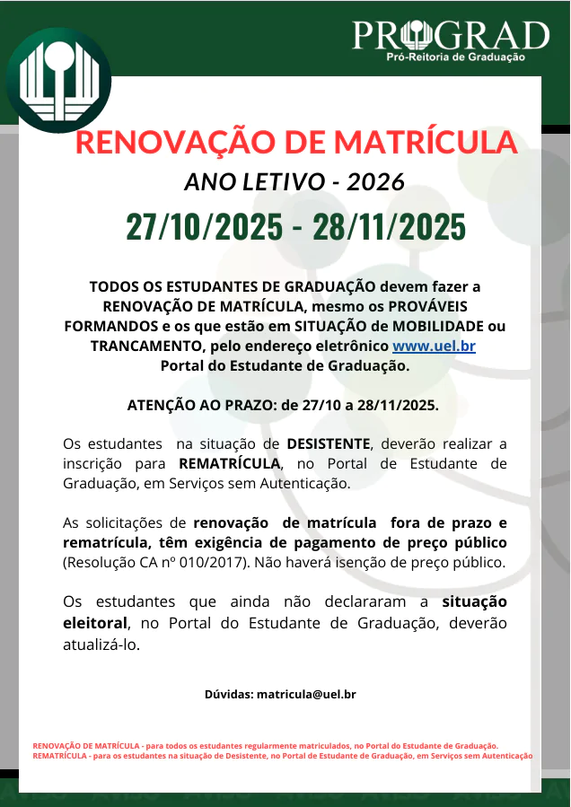 As renovações devem ser feitas até o dia 28 de novembroTeve início no dia 27 de outubro o período de renovação de matrícula para o ano letivo de 2026. As renovações devem ser realizadas exclusivamente pelo Portal do Estudante da UEL.