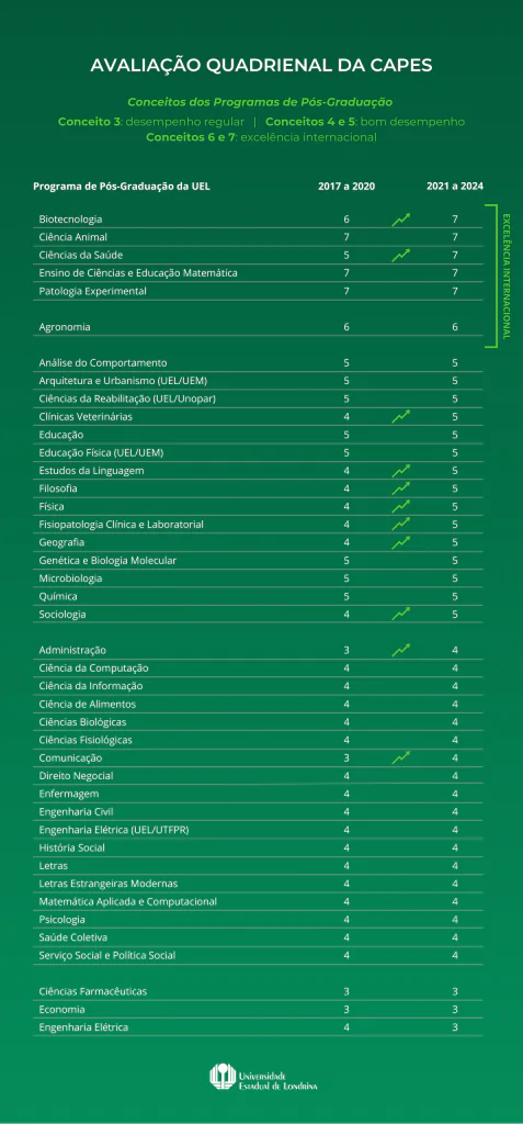 A partir desta avaliação da Capes, a UEL elenca cinco programas de excelência internacional, se destacando nas áreas de saúde, biotecnologia e exatas. De acordo com informações da Pró-reitoria de Pesquisa e Pós-graduação (PRoPPG), a Universidade soma 49 programas, sendo 42 com sede em seu Campus, em Londrina e integra outros sete nacionais. As notas divulgadas se referem aos programas sediados na UEL, totalizando: