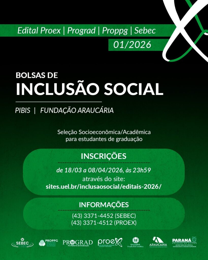 As vagas são destinadas a estudantes de graduação da UEL que ingressaram por meio de políticas afirmativas.PROEX, PROGRAD, PRoPPG e SEBEC publicaram Edital para interessados/as nas Bolsas de Inclusão Social (PIBIS/Fundação Araucária). As inscrições podem ser realizadas até às 23h59 do dia 8 de abril de 2026, por meio do site oficial do programa.