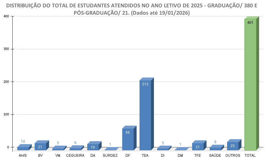 No ano letivo de 2025, o NAC acompanhou 401 alunos no âmbito da educação especial, sendo 380 na Graduação e 21 na Pós-Graduação. No gráfico, as condições atendidas e suas siglas: