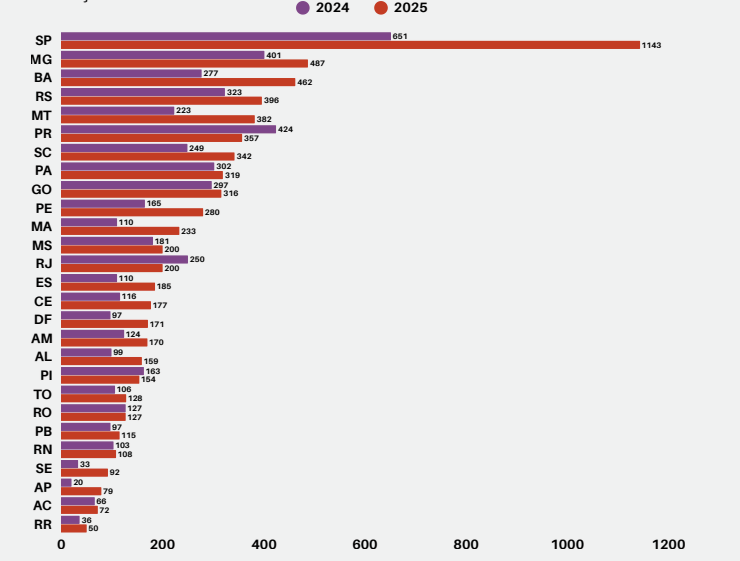 Os estados com mais registros são: São Paulo (1.143), Minas Gerais (487) e Bahia (462), que lideram em números absolutos. Somente três estados apresentaram diminuição no número de ocorrências, sendo o Paraná (de 424 a 357), Rio de Janeiro (de 250 a 200) e Piauí (de 163 a 154). Nos últimos dois anos, Rondônia permaneceu com 127 ocorrências. Confira os dados completos das Unidades da Federação: