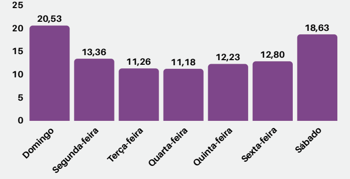 O relatório traz a distribuição de feminicídios por dias da semana, demonstrando que as datas de descanso, nas quais aumenta o convívio familiar, representam maior exposição ao risco para as mulheres. Domingo é o dia com a maior incidência (20%), seguido do sábado (18%). O mesmo ocorre nos meses comumente permeados por férias escolares, período em que as vítimas tendem a se afastar do trabalho.
