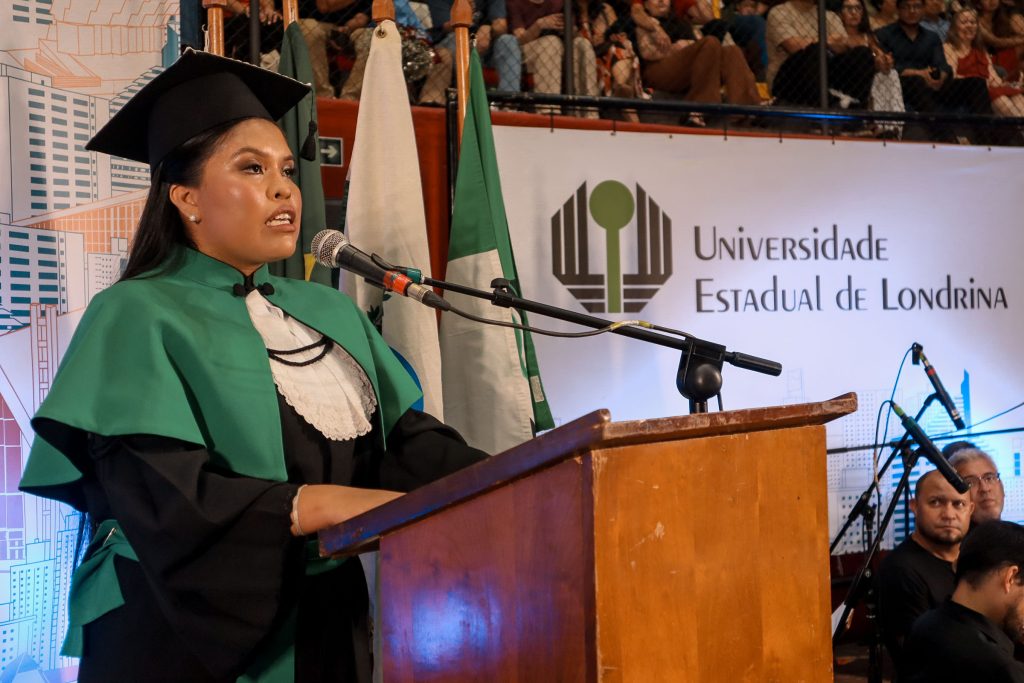 Recentemente, a UEL formou mais dois profissionais indígenas que colaram grau na última cerimônia no Moringão, realizada nos dias 12 e 13 de fevereiro: Mainara Fygte Lourenço em enfermagem e Caio No Sãnh Deodoro em Design Gráfico, ambos indígenas Kaingang.
