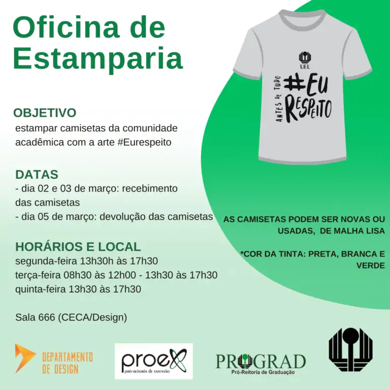 Para aumentar o engajamento dos ingressantes na campanha #AntesdeTudoEuRespeito, uma ação do Departamento de Design Gráfico da UEL e a Comissão de Recepção vai estampar camisetas lisas, novas ou usadas, com a logo da campanha. A estamparia fica aberta na sala 666 do CECA para receber as camisetas a serem estampadas na segunda (2) das 13h30 às 17h30 e terça (3), das 8h às 12h e depois das 13h30 às 17h30 que serão devolvidas estampadas na quinta, das 13h30 às 17h30.