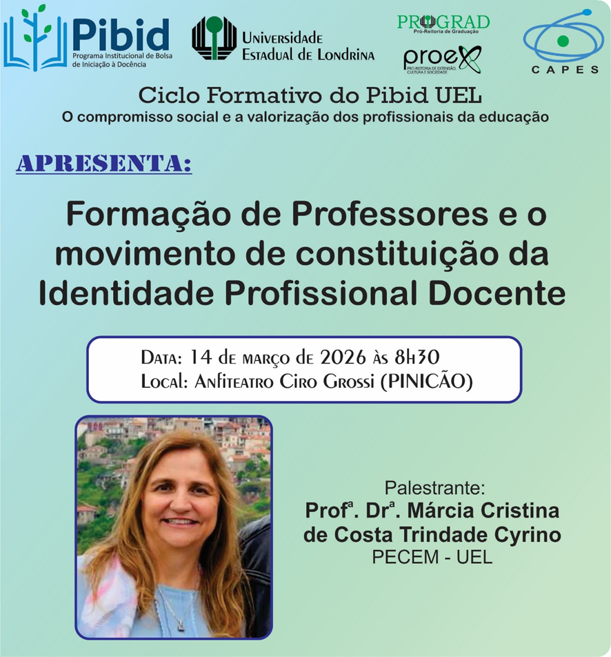 Estudantes e professores dos cursos de licenciatura participam amanhã (sábado, 14) do Ciclo Formativo do Programa Institucional de Bolsas de Iniciação à Docência (PIBID-UEL). O evento é a partir das 8h no Anfiteatro Cyro Grossi (CCB). O ciclo explora a temática do compromisso social e a valorização dos profissionais da educação. A realização marca oficialmente […]Estudantes e professores dos cursos de licenciatura participam amanhã (sábado, 14) do Ciclo Formativo do Programa Institucional de Bolsas de Iniciação à Docência (PIBID-UEL). O evento é a partir das 8h no Anfiteatro Cyro Grossi (CCB). O ciclo explora a temática do compromisso social e a valorização dos profissionais da educação.