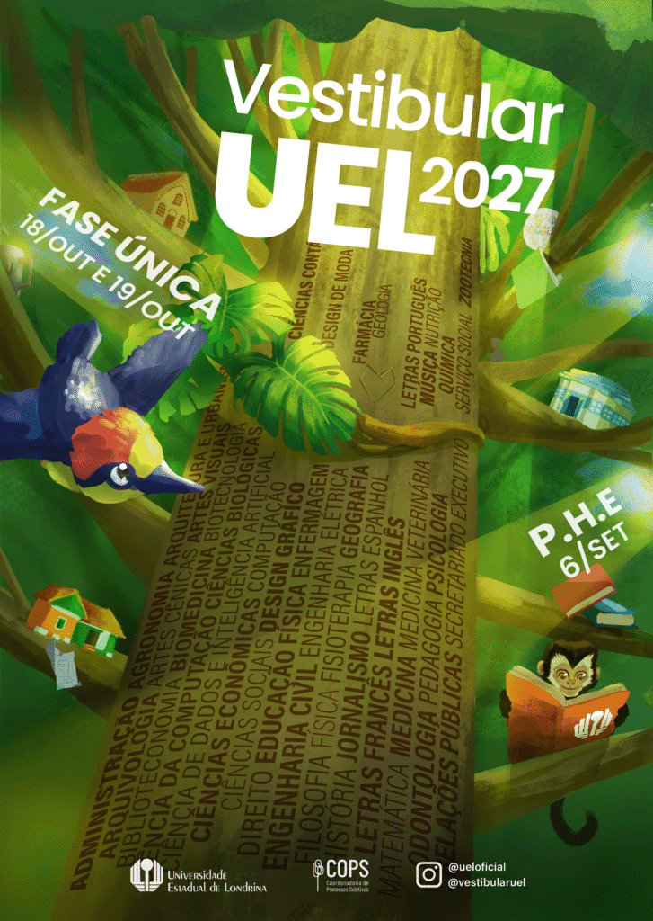 A escolha da arte vencedora ocorreu em segunda fase da votação realizada por membros da Cops e da Coordenadoria de Comunicação da UELA Coordenadoria de Processos Seletivos (Cops) da UEL anunciou na manhã desta terça-feira (7), a proposta escolhida para identidade visual do Vestibular UEL 2027. O concurso seletivo será realizado nos dias 18 e 19 de outubro. As provas de habilidades específicas (PHE) estão programadas para o dia 6 de setembro. A abertura das inscrições e valores serão definidos proximamente.